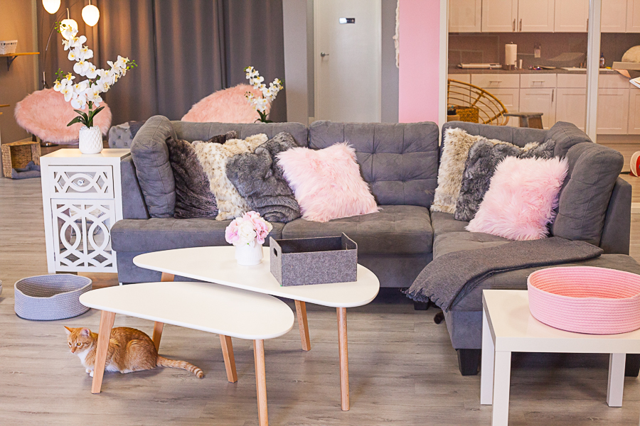 Our cat lounge vibe is a relaxing minimalistic space that feels oh so luxe with our furry friends, Nordic styles, comfy furniture, furry pillows and floor futons. It serves as a foster home for over 50 resident cats and kittens. Enjoy your favorite beverage in company with cats and kittens or both. It is a 2,000 square foot space with very spacious lounges for the cat and kittens designed for entertainment and playing or relaxing and cuddles. Enjoy our most popular room dedicated to kittens!!